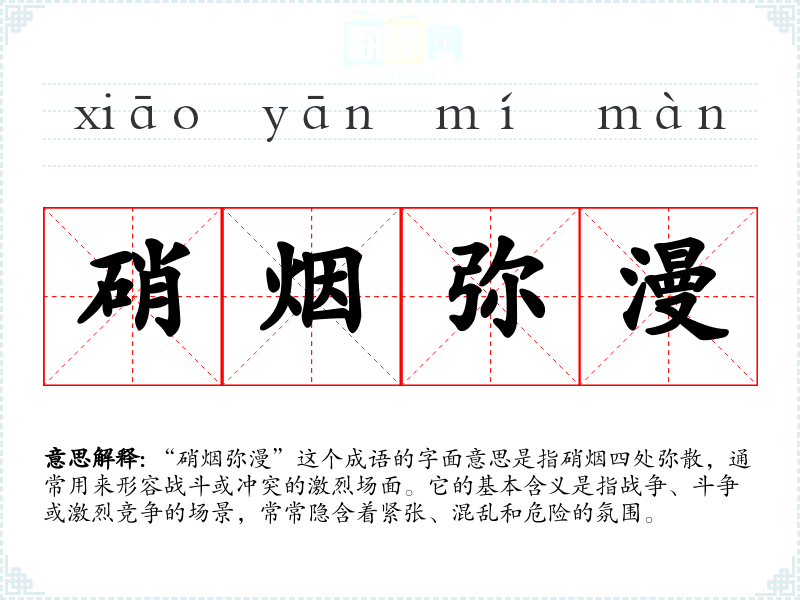 “硝烟弥漫”这个成语的字面意思是指硝烟四处弥散,通常用来形容战斗或冲突的激烈场面。它的基本含义是指战争、斗争或激烈竞争的场景,常常隐含着紧张、混乱和危险的氛围。