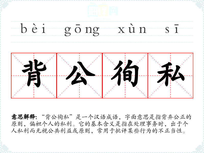 该成语的具体来源并不明确,但“背公”和“徇私”两个词汇都有着深厚的历史根基。“公”与“私”的对立在**传统文化中有着重要的位置,强调了社会公德与个人私欲之间的矛盾。成语可能源于古代对官员或社会人物的不满,尤其是在贪污腐败的背景下。