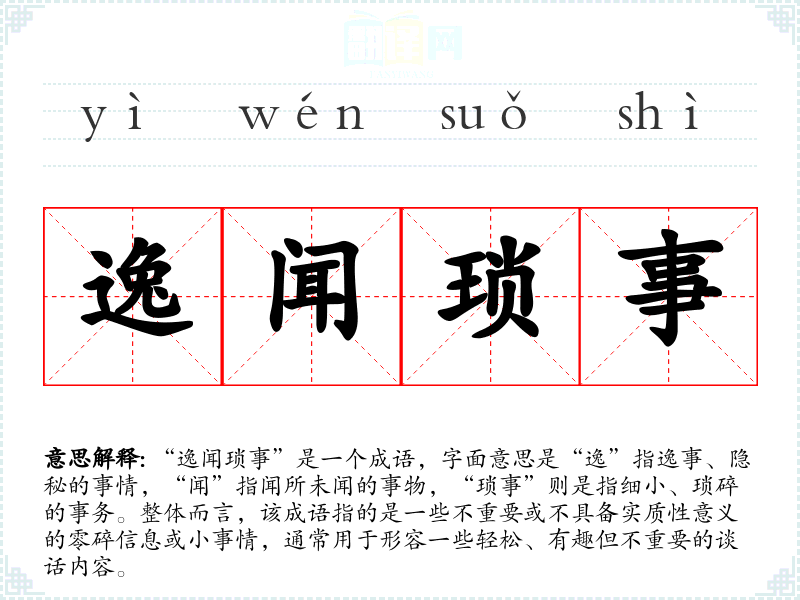 “逸闻琐事”是一个成语,字面意思是“逸”指逸事、隐秘的事情,“闻”指闻所未闻的事物,“琐事”则是指细小、琐碎的事务。整体而言,该成语指的是一些不重要或不具备实质性意义的零碎信息或小事情,通常用于形容一些轻松、有趣但不重要的谈话内容。