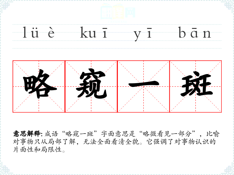 成语“略窥一斑”字面意思是“略微看见一部分”,比喻对事物只从局部了解,无法全面看清全貌。它强调了对事物认识的片面性和局限性。