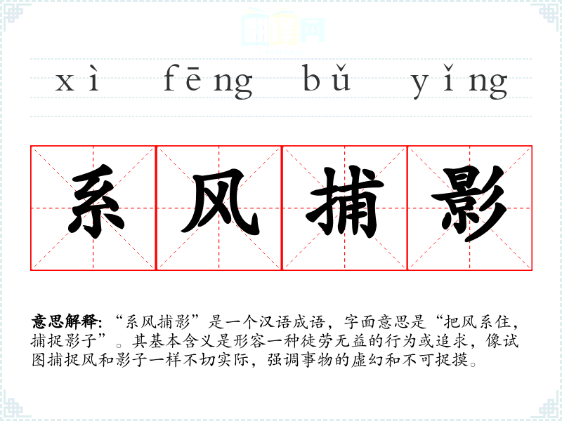 “系风捕影”是一个汉语成语,字面意思是“把风系住,捕捉影子”。其基本含义是形容一种徒劳无益的行为或追求,像试图捕捉风和影子一样不切实际,强调事物的虚幻和不可捉摸。