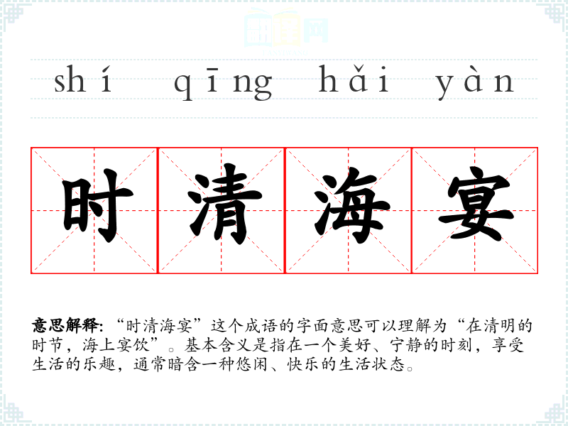 “时清海宴”这个成语的字面意思可以理解为“在清明的时节,海上宴饮”。基本含义是指在一个美好、宁静的时刻,享受生活的乐趣,通常暗含一种悠闲、快乐的生活状态。
