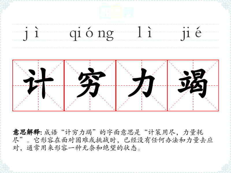 成语“计穷力竭”的字面意思是“计策用尽,力量耗尽”。它形容在面对困难或挑战时,已经没有任何办法和力量去应对,通常用来形容一种无奈和绝望的状态。