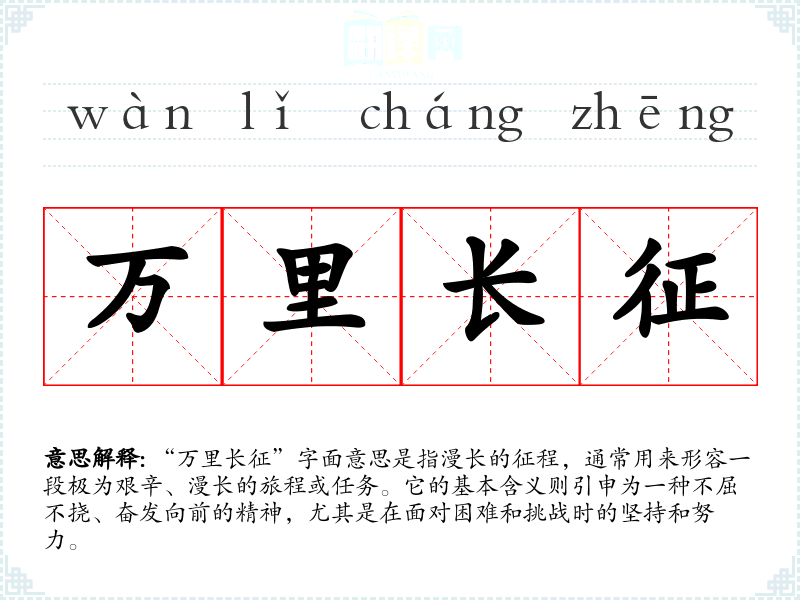 “万里长征”字面意思是指漫长的征程,通常用来形容一段极为艰辛、漫长的旅程或任务。它的基本含义则引申为一种不屈不挠、奋发向前的精神,尤其是在面对困难和挑战时的坚持和努力。