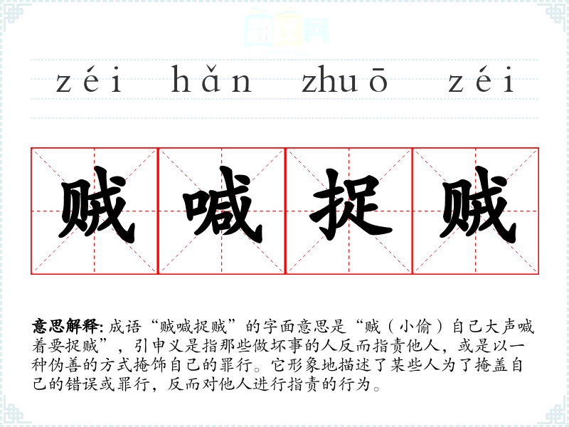 成语“贼喊捉贼”的字面意思是“贼(小偷)自己大声喊着要捉贼”,引申义是指那些做坏事的人反而指责他人,或是以一种伪善的方式掩饰自己的罪行。它形象地描述了某些人为了掩盖自己的错误或罪行,反而对他人进行指责的行为。