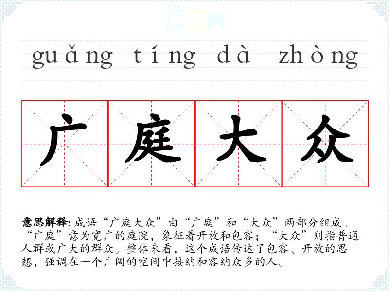 成语“广庭大众”由“广庭”和“大众”两部分组成。“广庭”意为宽广的庭院,象征着开放和包容;“大众”则指普通人群或广大的群众。整体来看,这个成语传达了包容、开放的思想,强调在一个广阔的空间中接纳和容纳众多的人。