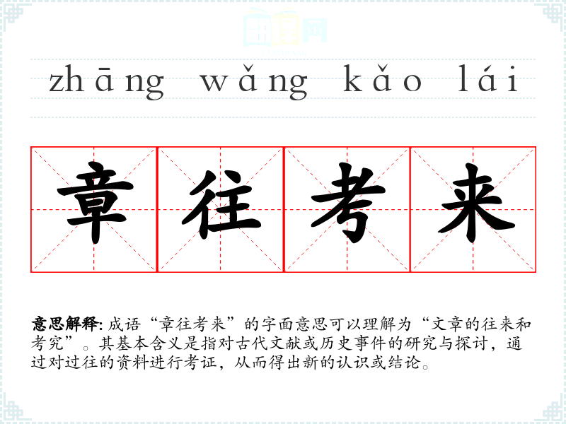 成语“章往考来”的字面意思可以理解为“文章的往来和考究”。其基本含义是指对古代文献或历史**的研究与探讨,通过对过往的资料进行考证,从而得出新的认识或结论。
