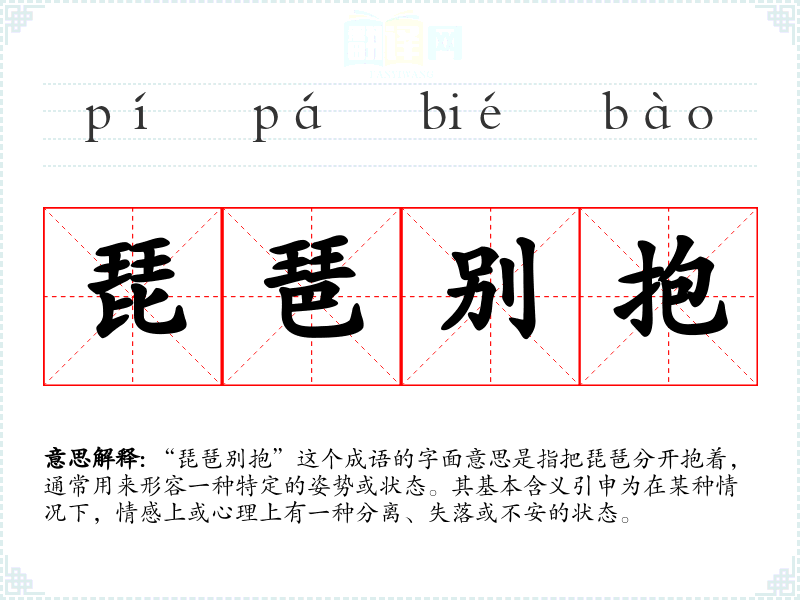 “琵琶别抱”这个成语的字面意思是指把琵琶分开抱着,通常用来形容一种特定的姿势或状态。其基本含义引申为在某种情况下,情感上或心理上有一种分离、失落或不安的状态。