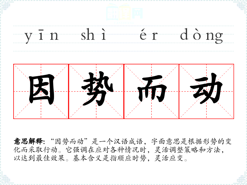 “因势而动”是一个汉语成语,字面意思是根据形势的变化而采取行动。它强调在应对各种情况时,灵活调整策略和方法,以达到最佳效果。基本含义是指顺应时势,灵活应变。