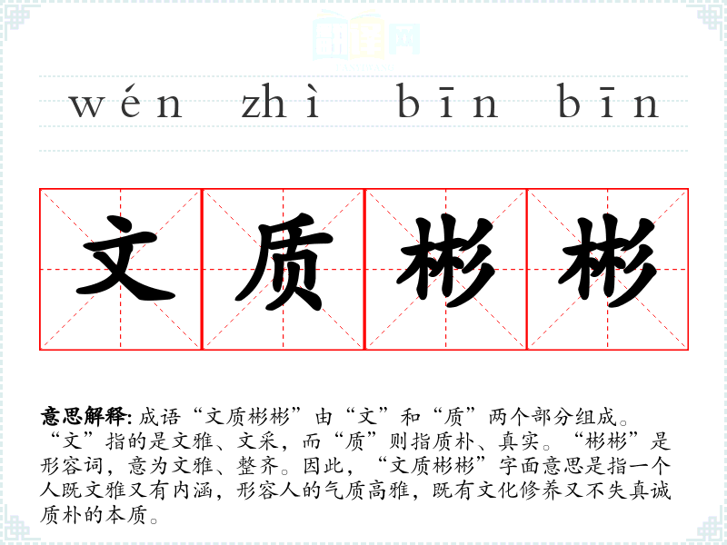 成语“文质彬彬”由“文”和“质”两个部分组成。“文”指的是文雅、文采,而“质”则指质朴、真实。“彬彬”是形容词,意为文雅、整齐。因此,“文质彬彬”字面意思是指一个人既文雅又有内涵,形容人的气质高雅,既有文化修养又不失真诚质朴的本质。