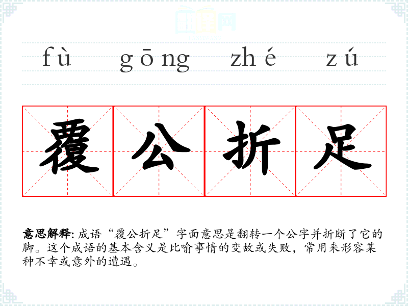 成语“覆公折足”字面意思是翻转一个公字并折断了它的脚。这个成语的基本含义是比喻事情的变故或失败,常用来形容某种不幸或意外的遭遇。