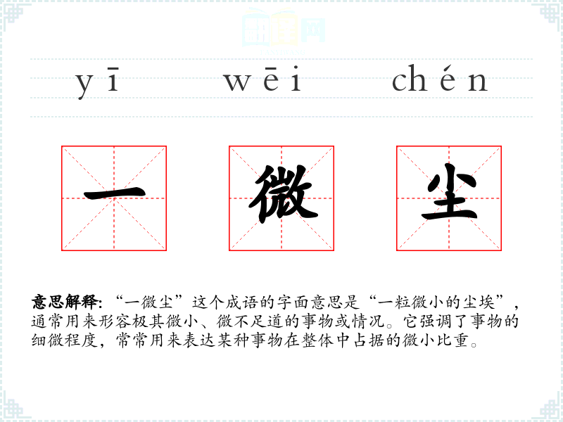 “一微尘”这个成语的字面意思是“一粒微小的尘埃”,通常用来形容极其微小、微不足道的事物或情况。它强调了事物的细微程度,常常用来表达某种事物在整体中占据的微小比重。