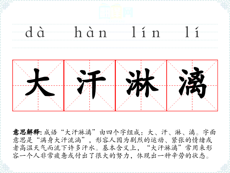 成语“大汗淋漓”由四个字组成:大、汗、淋、漓。字面意思是“满身大汗流淌”,形容人因为剧烈的**、紧张的情绪或者高温天气而流下许多汗水。基本含义上,“大汗淋漓”常用来形容一个人非常疲惫或付出了很大的努力,体现出一种辛劳的状态。