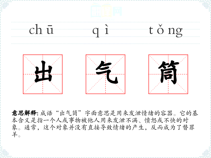 成语“出气筒”字面意思是用来发泄情绪的容器。它的基本含义是指一个人或事物被他人用来发泄不满、愤怒或不快的对象。通常,这个对象并没有直接导致情绪的产生,反而成为了替罪羊。