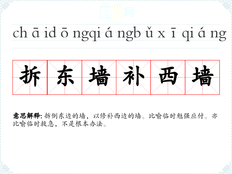 拆倒东边的墙,以修补西边的墙。比喻临时勉强应付。亦比喻临时救急,不是根本办法。 |