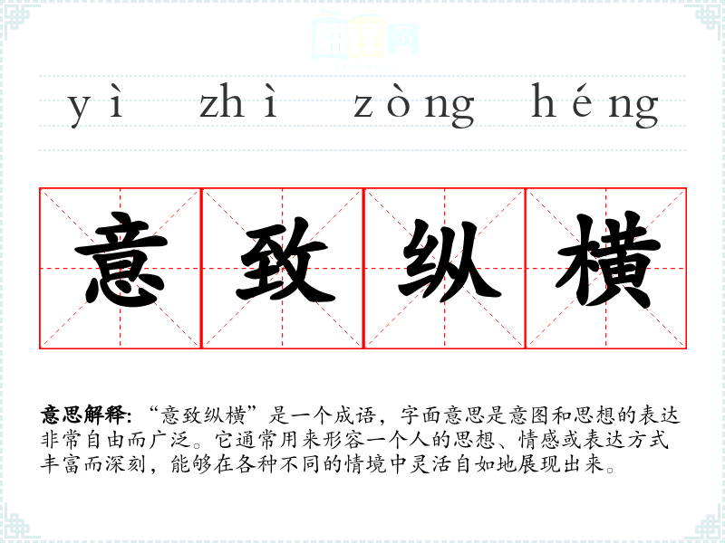 “意致纵横”并没有明确的历史来源或典故,但其构成的词汇本身便蕴含了丰富的文化内涵。“意致”可以理解为思想和情感的深度与广度,而“纵横”则表示在空间或时间上的自由流动,象征着思想的灵活性和创新性。