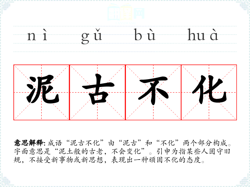 成语“泥古不化”由“泥古”和“不化”两个部分构成。字面意思是“泥土般的古老,不会变化”。引申为指某些人固守旧规,不接受新事物或新思想,表现出一种顽固不化的态度。