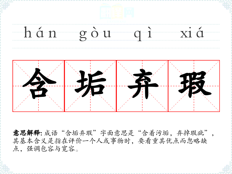 成语“含垢弃瑕”字面意思是“含着污垢,弃掉瑕疵”,其基本含义是指在评价一个人或事物时,要看重其优点而忽略缺点,强调包容与宽容。
