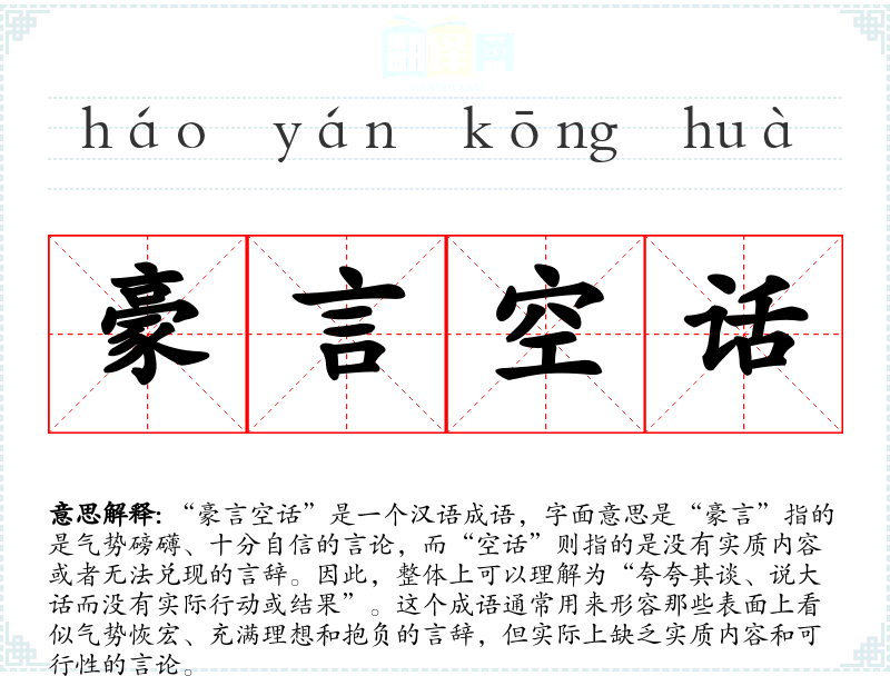 “豪言空话”并没有明确的历史典故或文学出处,但它的构成可以追溯到对“豪言壮语”的评价,强调其表面的华丽和缺乏实际依据的内容。类似的成语如“口惠而实不至”也有相似的意义,强调言辞与实际行动之间的差距。
