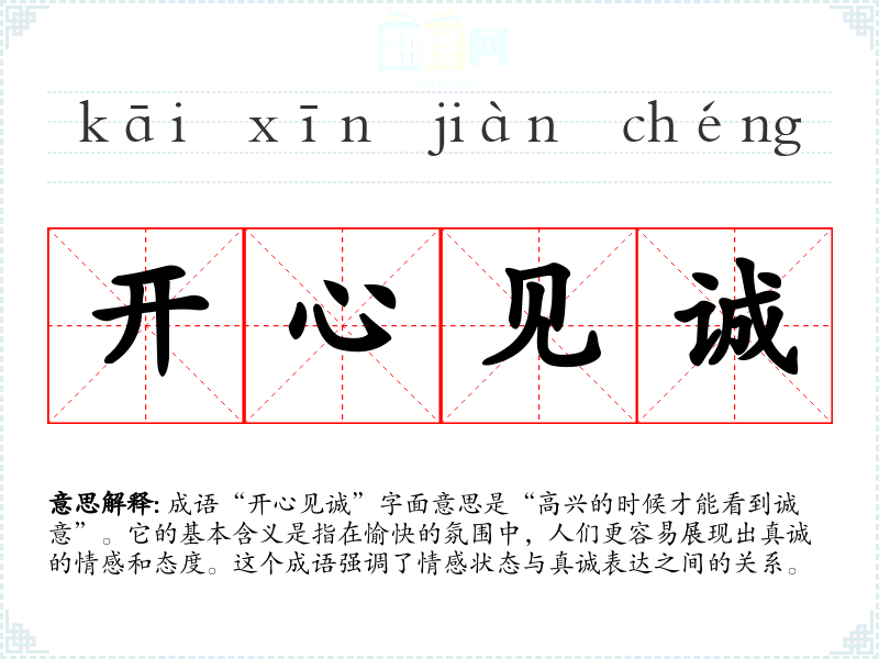 “开心见诚”并没有明确的历史典故或文学出处,但可以从其字面拆解来理解。“开”表示打开、开启,“心”指心情或内心,“见”是看到、显现,“诚”则是诚实、真诚。整体来看,这个成语强调在快乐的心情中,真诚的感情更容易被感知和表达。