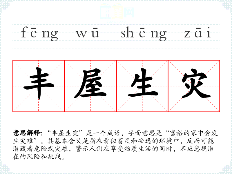 “丰屋生灾”是一个成语,字面意思是“富裕的家中会发生灾难”。其基本含义是指在看似富足和安逸的环境中,反而可能潜藏着危险或灾难,警示人们在享受物质生活的同时,不应忽视潜在的风险和挑战。