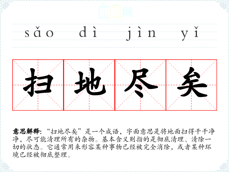 | 扫地无余 | 指彻底干净,毫无存留。同“扫地俱尽”。 |