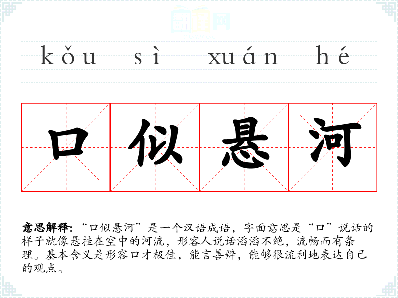 “口似悬河”是一个汉语成语,字面意思是“口”说话的样子就像悬挂在空中的河流,形容人说话滔滔不绝,流畅而有条理。基本含义是形容口才极佳,能言善辩,能够很流利地表达自己的观点。
