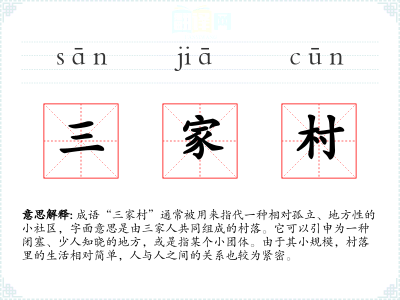 成语“三家村”通常被用来指代一种相对孤立、地方性的小社区,字面意思是由三家人共同组成的村落。它可以引申为一种闭塞、少人知晓的地方,或是指某个小团体。由于其小规模,村落里的生活相对简单,人与人之间的关系也较为紧密。