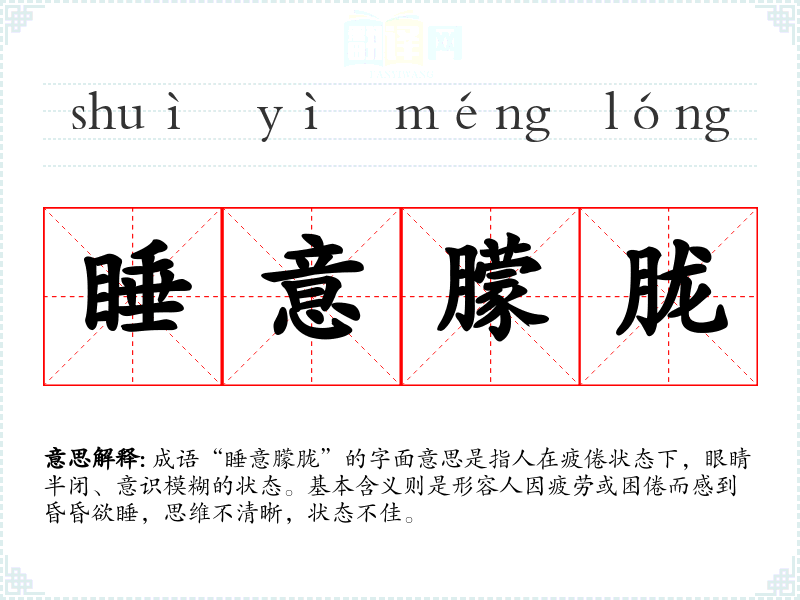成语“睡意朦胧”的字面意思是指人在疲倦状态下,眼睛半闭、意识模糊的状态。基本含义则是形容人因疲劳或困倦而感到昏昏欲睡,思维不清晰,状态不佳。