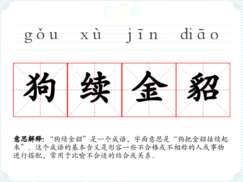 “狗续金貂”是一个成语,字面意思是“狗把金貂接续起来”。这个成语的基本含义是形容一些不合格或不相称的人或事物进行搭配,常用于比喻不合适的结合或关系。
