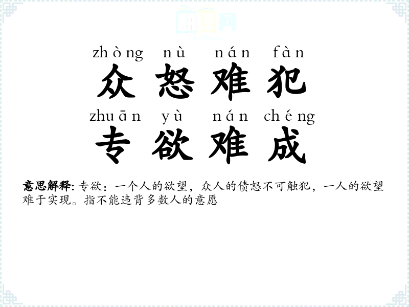 专欲:一个人的欲望,众人的债怒不可触犯,一人的欲望难于实现。指不能违背多数人的意愿 |