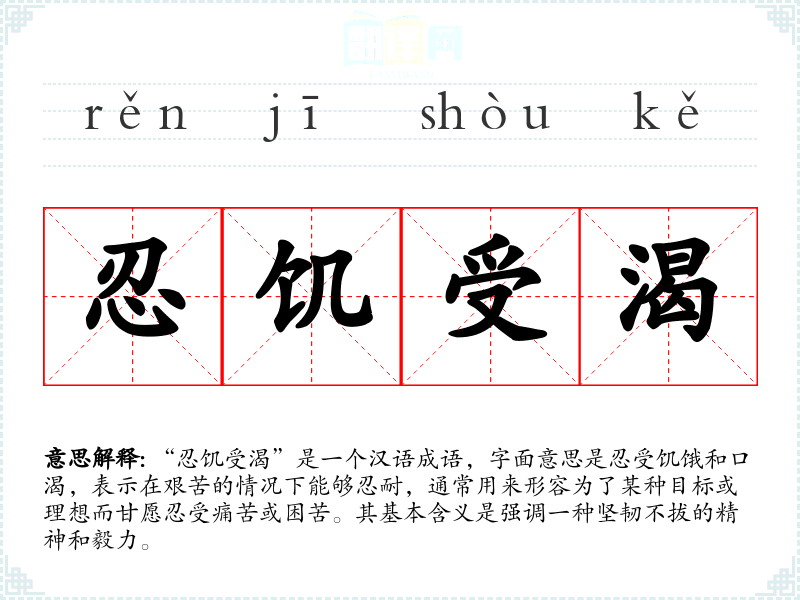 在英语中,与“忍饥受渴”相似的表达是“endure hardship”或“suffer for a cause”。这些表达在强调忍耐和坚持的同时,也反映了对目标的坚定追求。