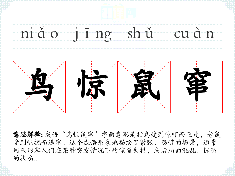 成语“鸟惊鼠窜”字面意思是指鸟受到惊吓而飞走,老鼠受到惊扰而逃窜。这个成语形象地描绘了紧张、恐慌的场景,通常用来形容人们在某种突发情况下的惊慌失措,或者局面混乱、惊恐的状态。