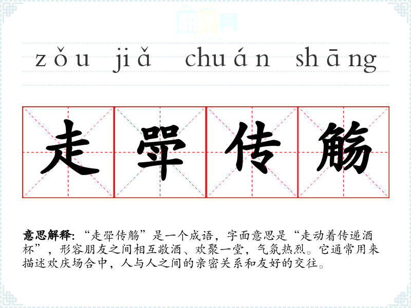 “走斝传觞”是一个成语,字面意思是“走动着传递酒杯”,形容朋友之间相互敬酒、欢聚一堂,气氛热烈。它通常用来描述欢庆场合中,人与人之间的亲密关系和友好的交往。