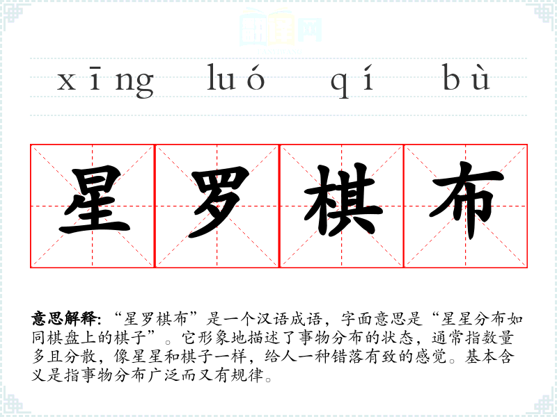“星罗棋布”是一个汉语成语,字面意思是“星星分布如同棋盘上的棋子”。它形象地描述了事物分布的状态,通常指数量多且分散,像星星和棋子一样,给人一种错落有致的感觉。基本含义是指事物分布广泛而又有规律。