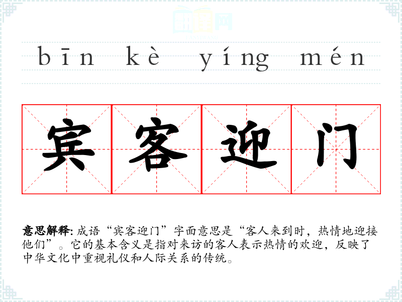 成语“宾客迎门”字面意思是“客人来到时,热情地迎接他们”。它的基本含义是指对来访的客人表示热情的欢迎,反映了中华文化中重视礼仪和人际关系的传统。