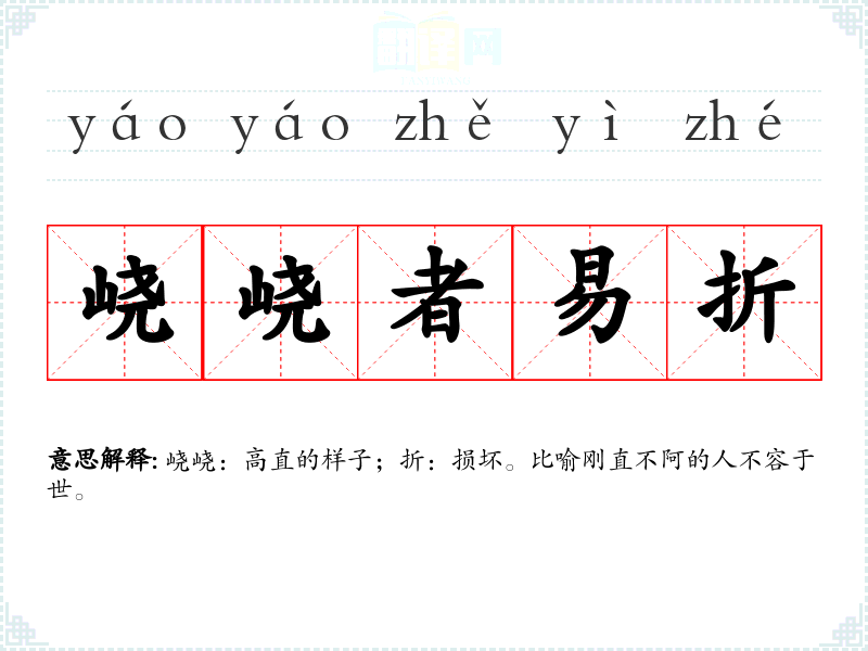 | 峣峣者易折 | 峣峣:高直的样子;折:损坏。比喻刚直不阿的人不容于世。 |