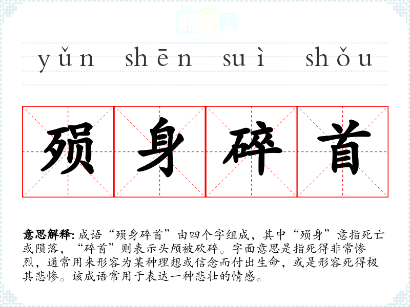 成语“殒身碎首”由四个字组成,其中“殒身”意指死亡或陨落,“碎首”则表示头颅被砍碎。字面意思是指死得非常惨烈,通常用来形容为某种理想或信念而付出生命,或是形容死得极其悲惨。该成语常用于表达一种悲壮的情感。