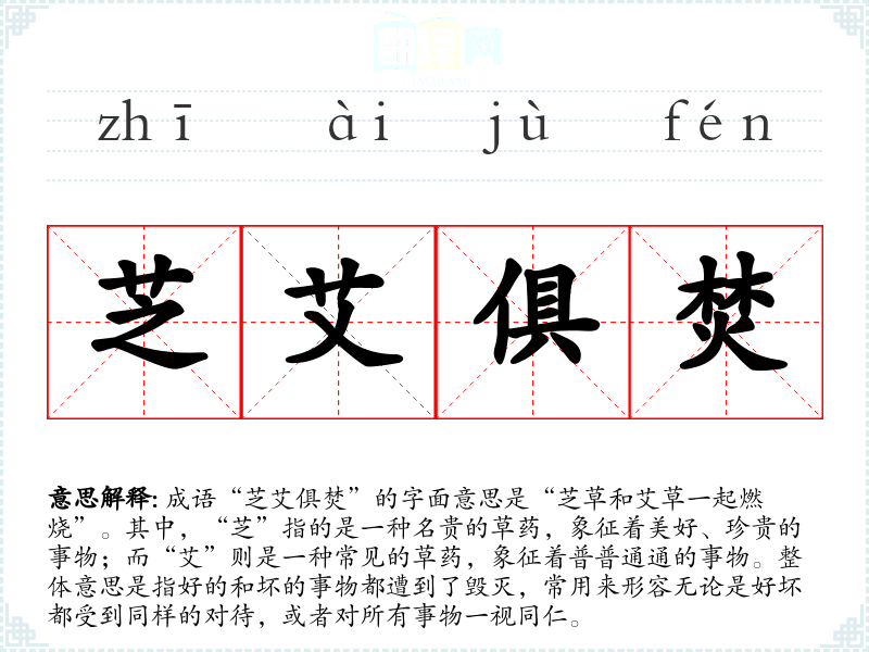 | 芝艾共焚 | 犹玉石俱焚。比喻贵贱、贤愚、良莠同归于尽。同“芝艾并焚”。 |