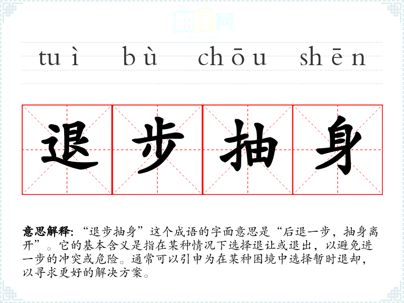 “退步抽身”这个成语的字面意思是“后退一步,抽身离开”。它的基本含义是指在某种情况下选择退让或退出,以避免进一步的冲突或危险。通常可以引申为在某种困境中选择暂时退却,以寻求更好的解决方案。
