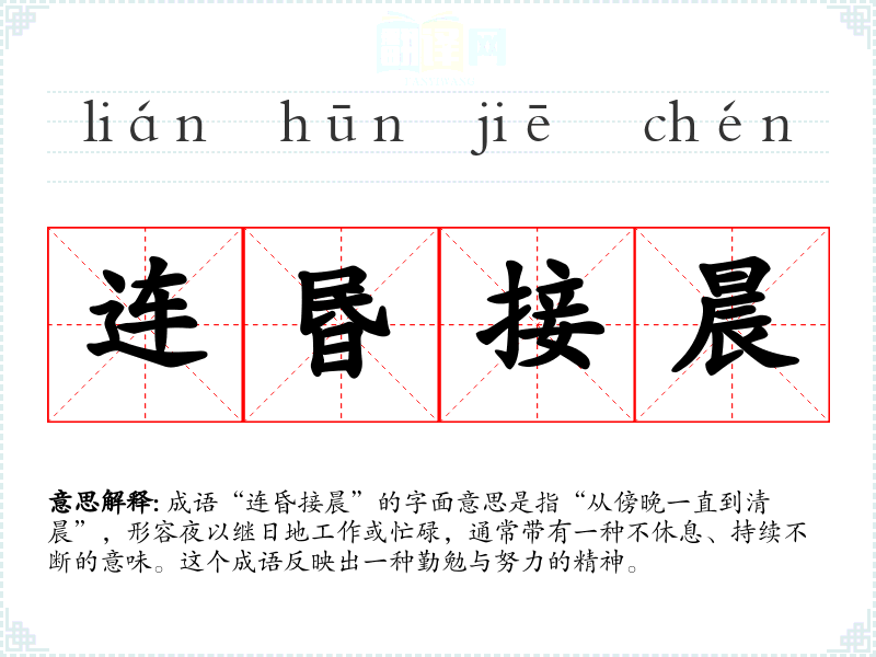 成语“连昏接晨”的字面意思是指“从傍晚一直到清晨”,形容夜以继日地工作或忙碌,通常带有一种不休息、持续不断的意味。这个成语反映出一种勤勉与努力的精神。