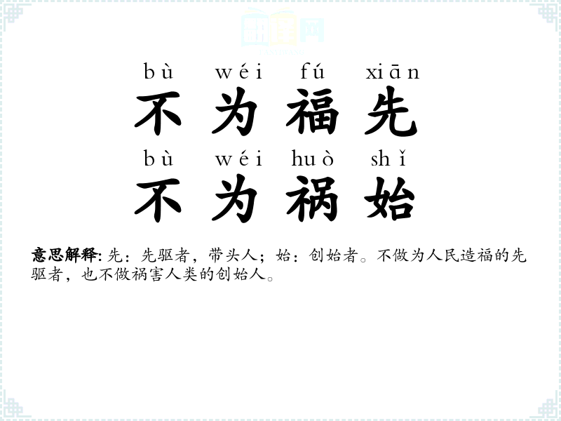 先:先驱者,带头人;始:创始者。不做为人民造福的先驱者,也不做祸害人类的创始人。 |