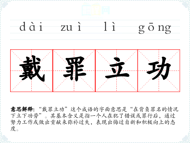 “戴罪立功”这个成语的字面意思是“在背负罪名的情况下立下功劳”。其基本含义是指一个人在犯了错误或罪行后,通过努力工作或做出贡献来弥补过失,表现出悔过自新和积极向上的态度。