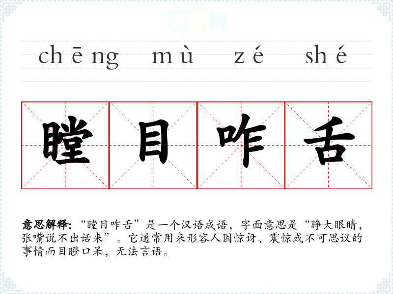 “瞠目咋舌”是一个汉语成语,字面意思是“睁大眼睛,张嘴说不出话来”。它通常用来形容人因惊讶、震惊或不可思议的事情而目瞪口呆,无法言语。