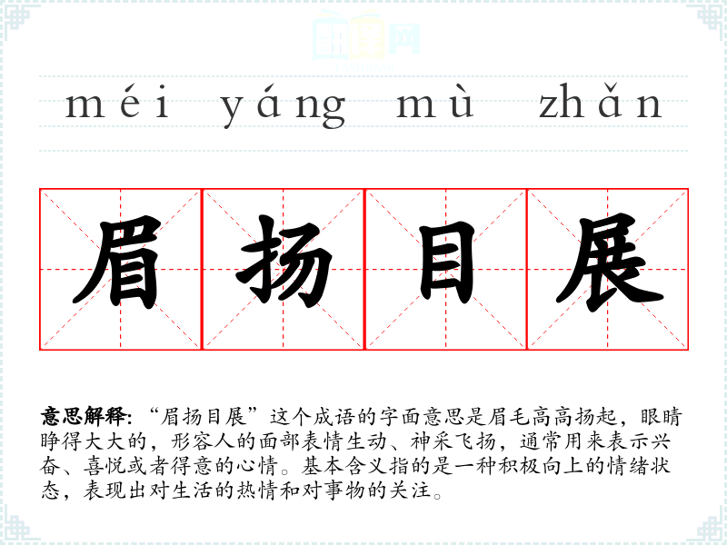 “眉扬目展”这个成语的字面意思是眉毛高高扬起,眼睛睁得大大的,形容人的面部表情生动、神采飞扬,通常用来表示兴奋、喜悦或者得意的心情。基本含义指的是一种积极向上的情绪状态,表现出对生活的热情和对事物的关注。