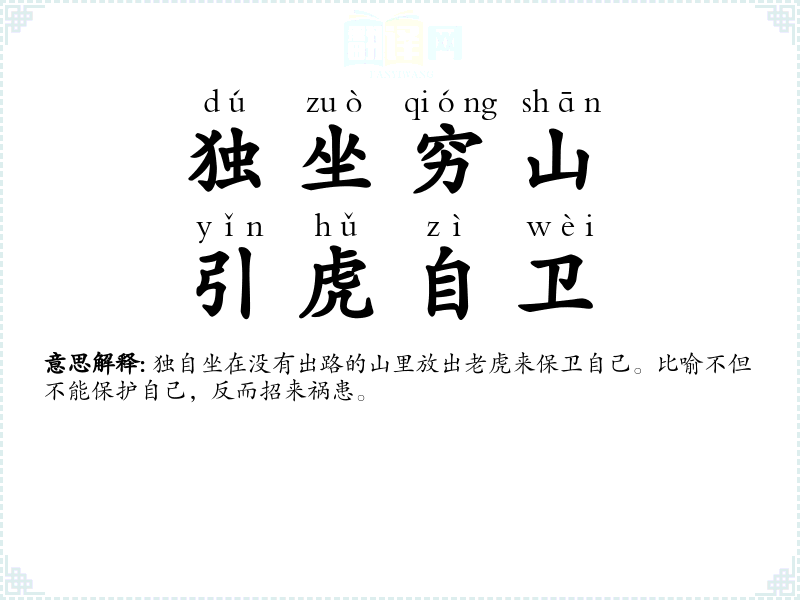 独自坐在没有出路的山里放出老虎来保卫自己。比喻不但不能保护自己,反而招来祸患。 |