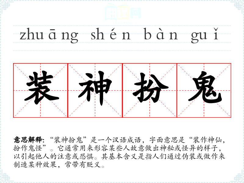 “装神扮鬼”是一个汉语成语,字面意思是“装作神仙,扮作鬼怪”。它通常用来形容某些人故意做出神秘或怪异的样子,以引起他人的注意或恐惧。其基本含义是指人们通过伪装或做作来制造某种效果,常带有贬义。