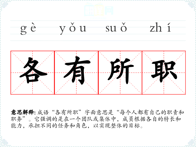 成语“各有所职”字面意思是“每个人都有自己的职责和职务”。它强调的是在一个团队或集体中,成员根据各自的特长和能力,承担不同的任务和角色,以实现整体的目标。