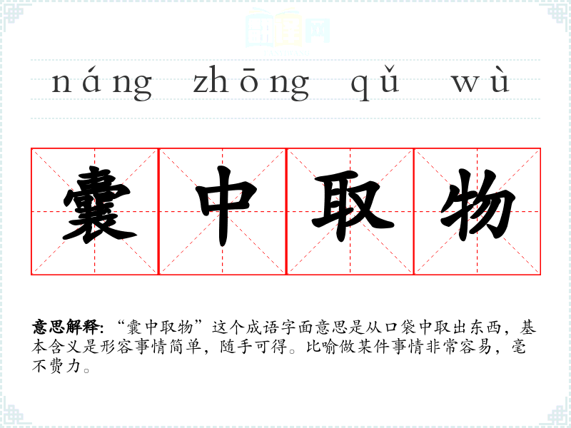 “囊中取物”这个成语字面意思是从口袋中取出东西,基本含义是形容事情简单,随手可得。比喻做某件事情非常容易,毫不费力。