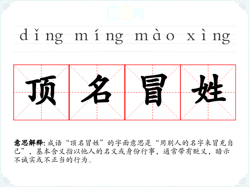 成语“顶名冒姓”的字面意思是“用别人的名字来冒充自己”,基本含义指以他人的名义或身份行事,通常带有贬义,暗示不诚实或不正当的行为。